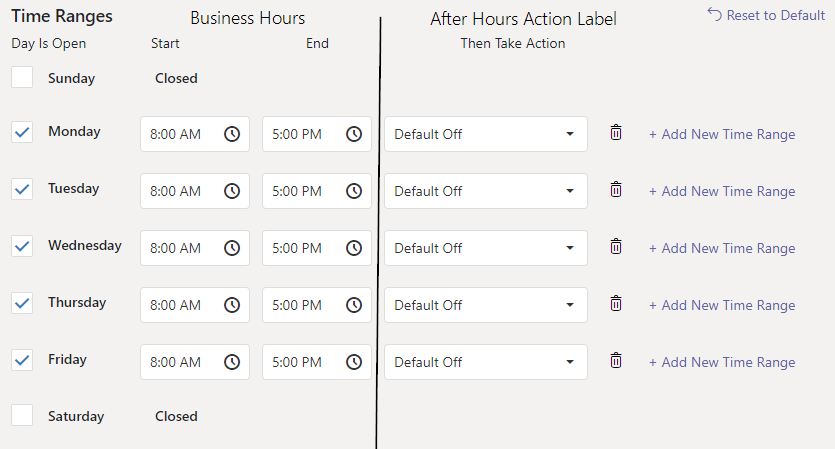 2. Add or edit the time ranges. Each time range includes a start time, end time, and a label for an action that will occur after hours (between this time range and the next time range). The actions for the after hours labels are specified when a business hour set is applied to a queue or IVR. Example below: